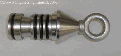 Disillusioned with the timber hitch in the winch cable on his JCB slipping off the PE half way through his pull, he resorted to using a length of fencing wire slipped through the flow holes of a Brewis Live Head (above right), knotted and attached to the winch hook. Although the Live Head was held in the PE only by the friction and wedging action of expanded "O" rings, there was sufficient grip to pull in fifty metres or more of pipe. "What they need is something like a live head but with much more grip" was the simple statement which resulted in the product which has become an icon in the No-Dig industry.